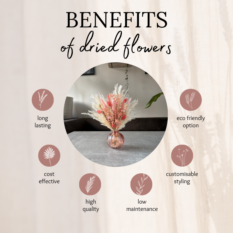 - Dried flowers and pampas last up to 3+ years; colours may fade over time.