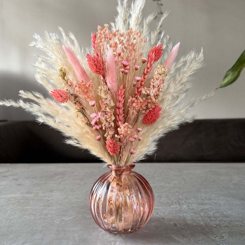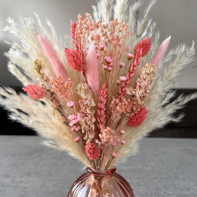 Some dried flower arrangements try too hard. Others barely try at all. But this Alena dried flower arrangement strikes that elusive perfect note – a dreamy balance of coral and pink tones, beautifully accented by fluffy cream pampas grass.