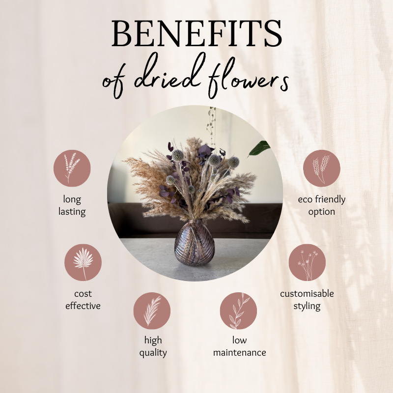 - Dried flowers and pampas last up to 3+ years; colours may fade over time.