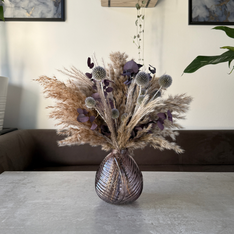 Isla combines the rich, bold tones of purple eucalyptus and thistles with the soft, natural textures of pampas grass and fluffy dried flowers. The amethyst-coloured lead vase adds a subtle sophistication, enhancing the vibrant purple tones while providing a sleek and modern base. Perfect for dining tables, windowsills, or bedroom furniture, Isla brings a natural yet striking aesthetic to your décor.