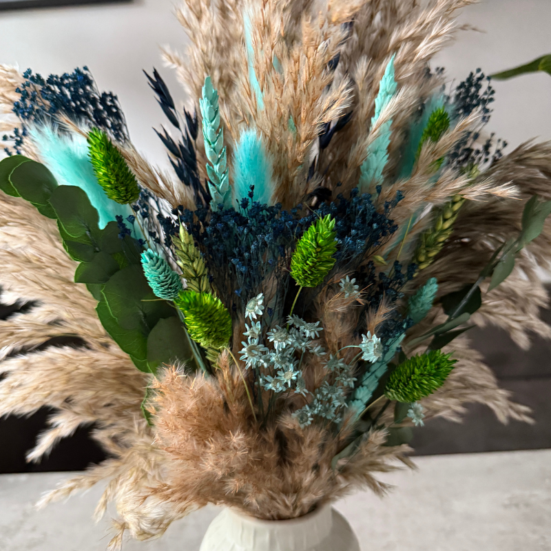 Keira’s combination of natural fluffy pampas grass with textured blue and green dried flowers creates a stunning visual effect. The mix of tones makes it a versatile yet bold piece, adding a touch of sophistication and life to any setting.