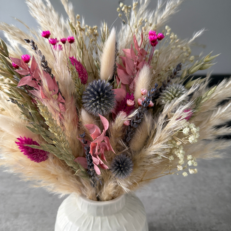 Some dried flower arrangements can feel overly simple, while others fail to captivate. Lolita strikes the perfect balance – a small-to-medium arrangement featuring fluffy cream pampas grass complemented by pink, purple, and green dried flowers.