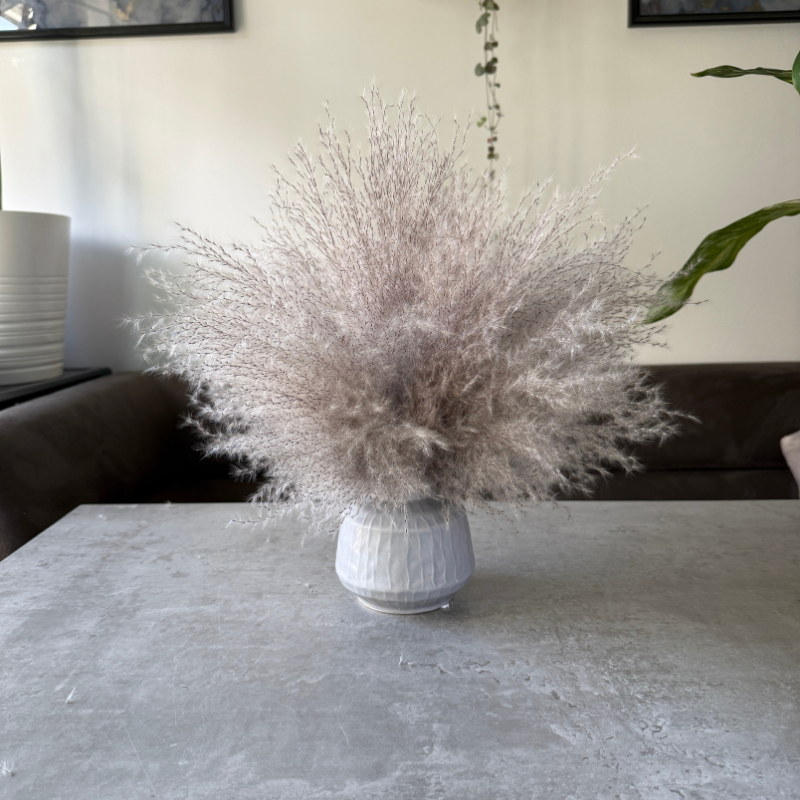 Some dried flower arrangements try too hard to make an impression, while others lack the quality to truly stand out. Margo strikes the perfect balance – a small-to-medium arrangement featuring fluffy grey pampas grass from our extra fluffy range, known for its luxurious texture and quality.