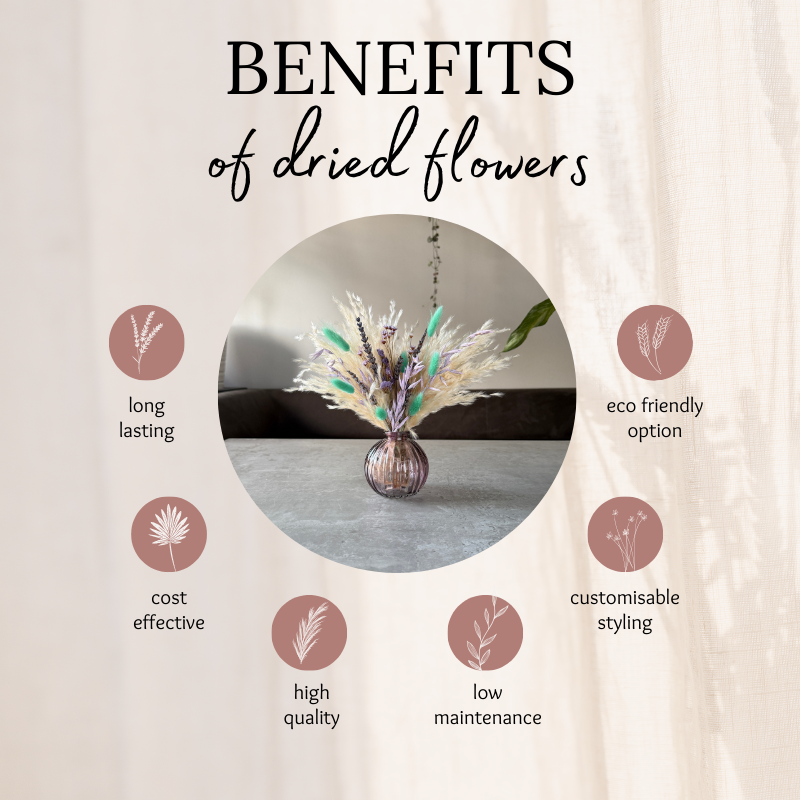- Dried flowers and pampas last up to 3+ years; colours may fade over time.