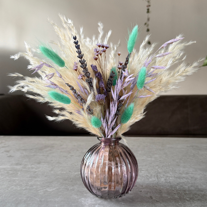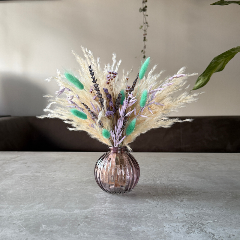 While many dried flower arrangements struggle to capture true beauty, Mollie stands apart with its refined blend of soft cream pampas grass interlaced with gentle lilac and subtle pink dried blooms. A vibrant dash of mint-coloured bunny tails and a whisper of lavender add an unexpected twist that makes this arrangement both sophisticated and utterly captivating.