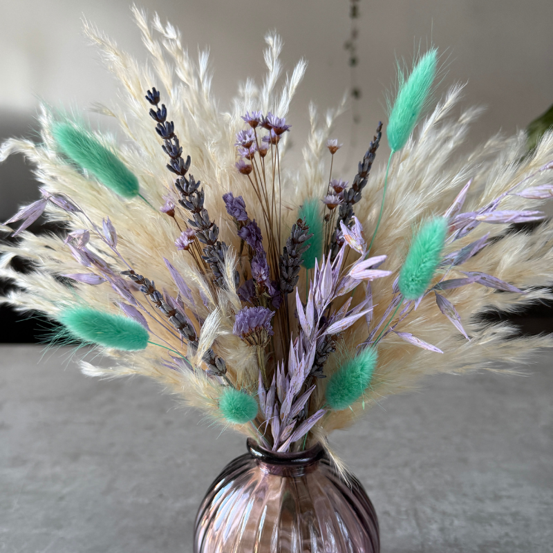 Mollie artfully blends soft, fluffy cream pampas grass with delicate lilac tones, accented by a refreshing pop of mint-coloured bunny tails and a hint of lavender. This mix of gentle hues and varied textures creates a design that is both vibrant and elegantly understated, evoking the freshness of spring in every detail.