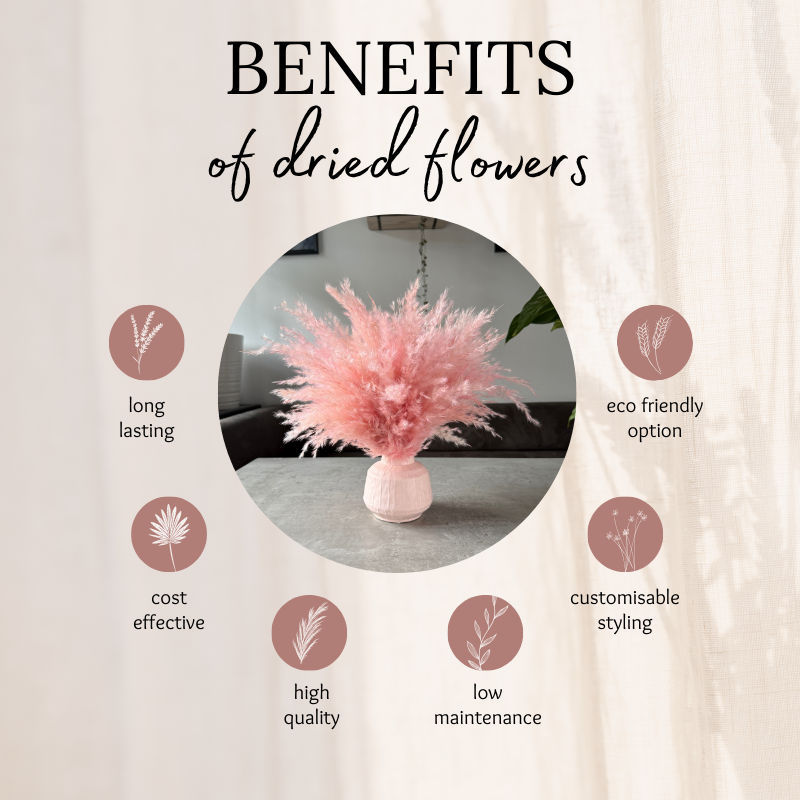 - Dried flowers and pampas last up to 3+ years; colours may fade over time.