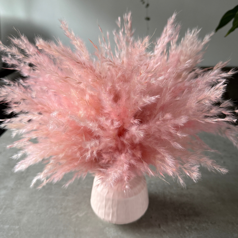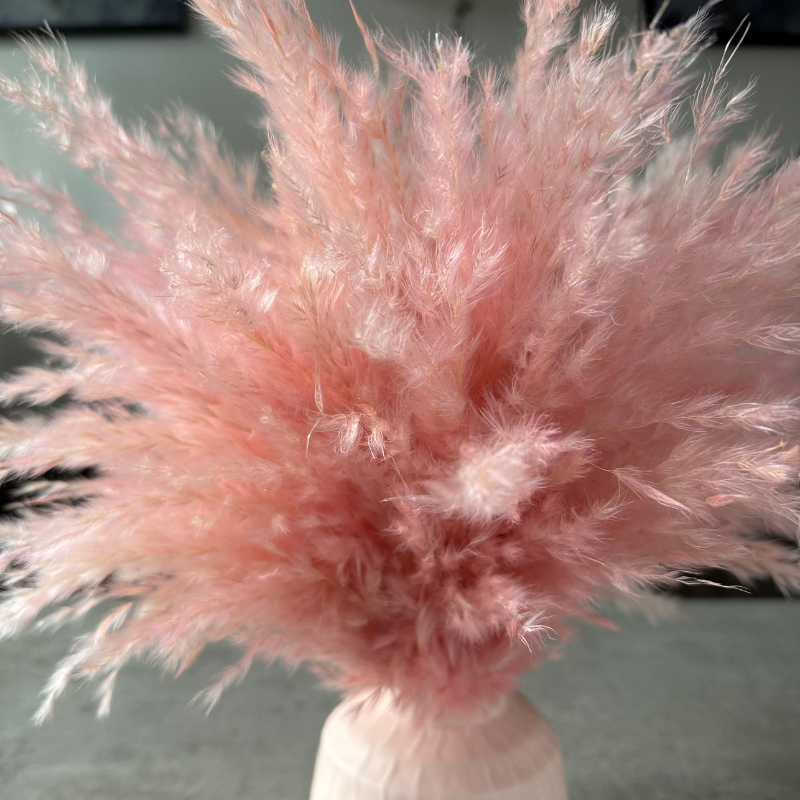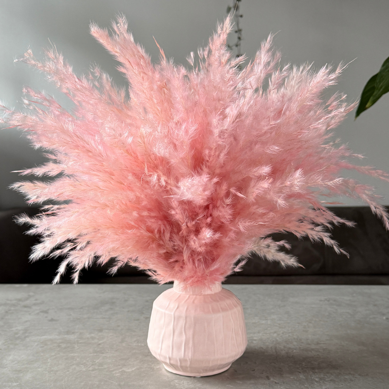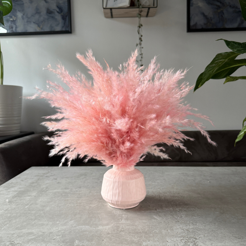 - Coordinated Vase: The light pink ceramic vase enhances the softness of the pampas, creating a cohesive and polished look.
