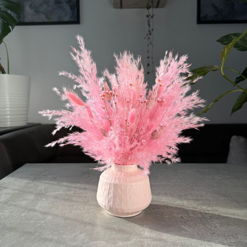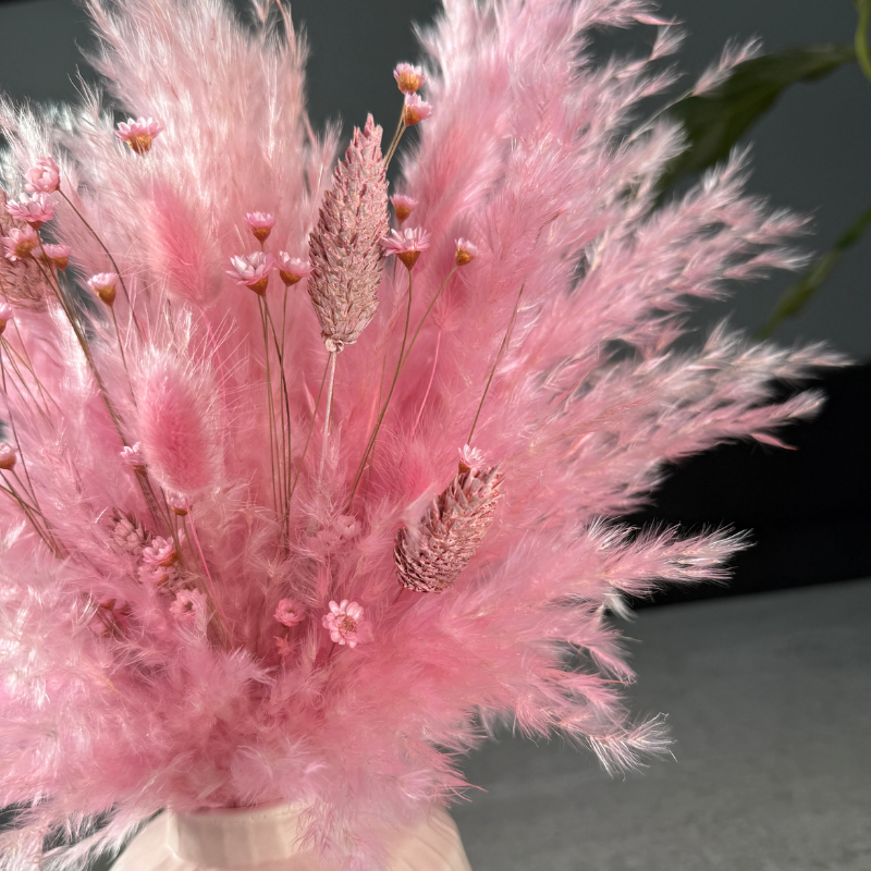 Some dried flower arrangements try to stand out too much, while others don’t feel special enough. Penelope strikes the perfect balance – a small-to-medium arrangement filled with fluffy, delicate pink dried flowers that radiate charm and beauty.