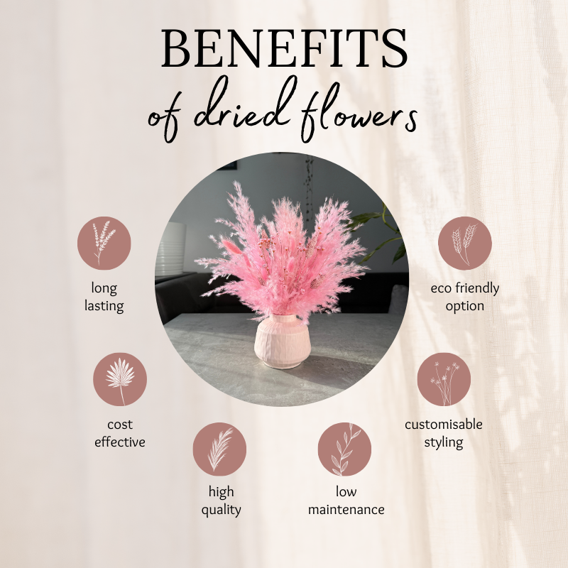 - Dried flowers and pampas last up to 3+ years; colours may fade over time.