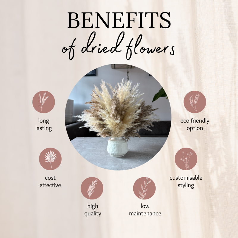 - Dried flowers and pampas last up to 3+ years; colours may fade over time.