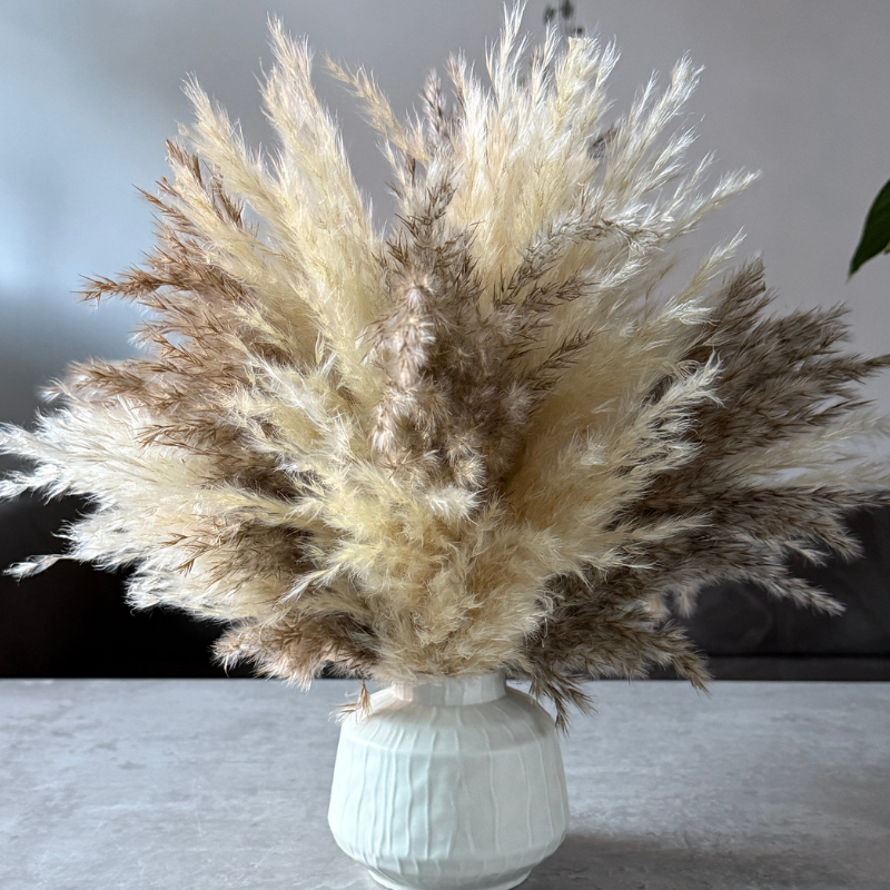 - Neutral Ceramic Vase: Provides a subtle yet stylish base, enhancing the softness and elegance of the pampas.